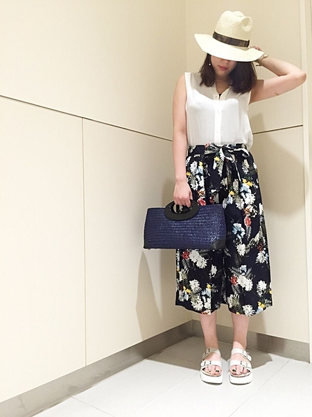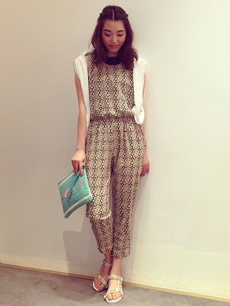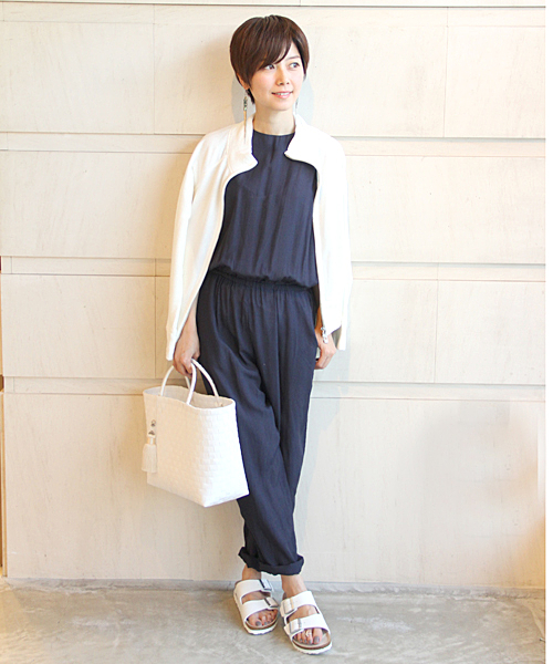 ヤシの木柄のオールイン和。都会のリゾートスタイルにぴったりなモノトーンが好印象。フラットサンダルにカジュアルに着こなしたいですね。