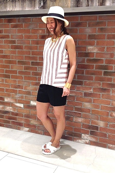 ストライプ柄の膝上丈バミューダパンツ。縦のラインが強調されスッキリとした印象です。女性らしいフェミニントップスと合わせて大人っぽい着こなしがおススメ。