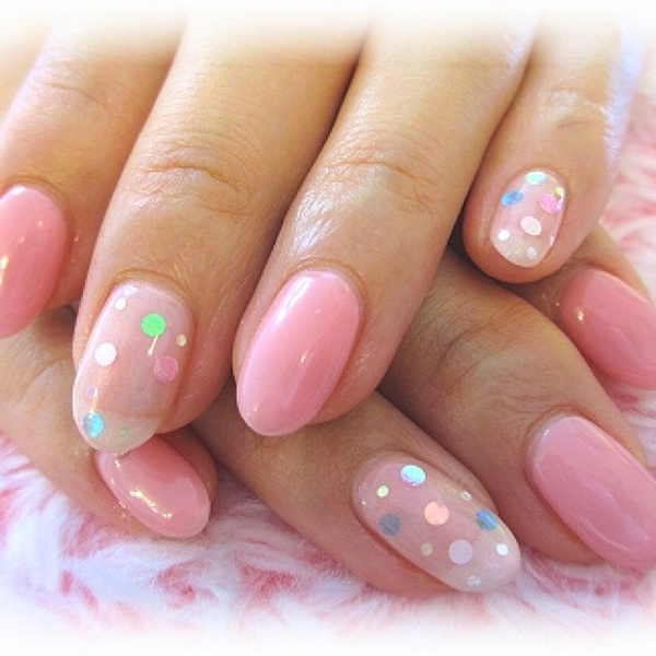 クリアベースにホワイトやイエロー、ピンクのホロ花をいっぱいのせて可愛く仕上げて・・♪