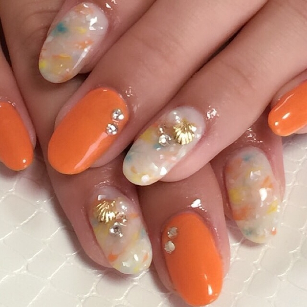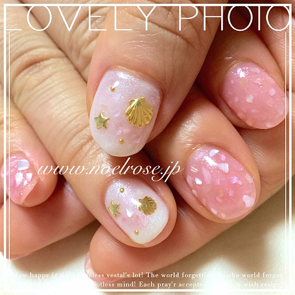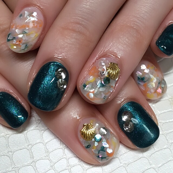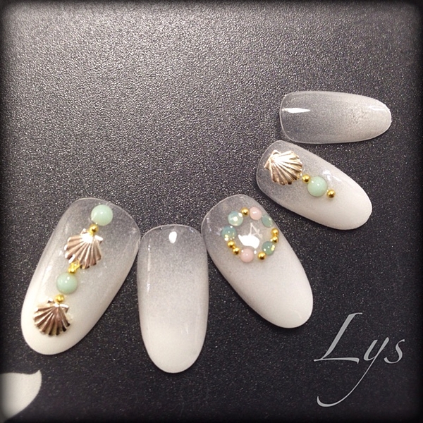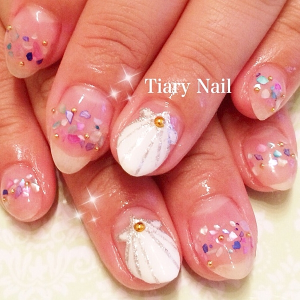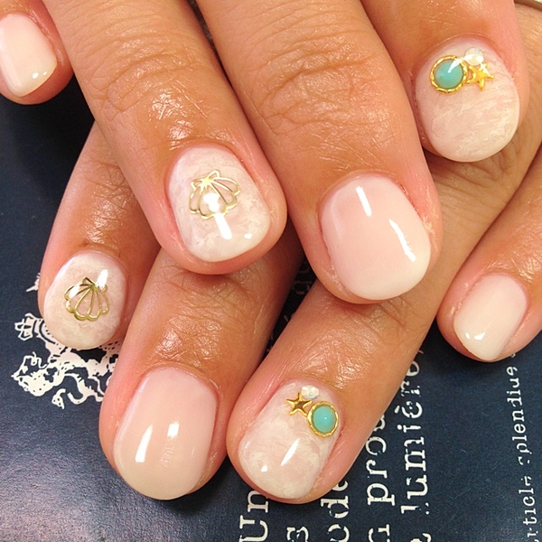 シェルやストーンがポイント的に置かれたシンプルでオシャレなネイルですね。