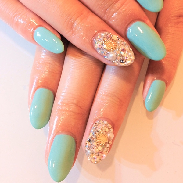 ストーンやシルバーシェルをのせて、夏を詰めこんで・・!ブルーのストーンがアクセントになりますね♪