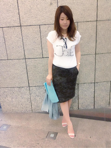 カモフラ柄のタイトスカートで、カジュアルながらも女性らしく。