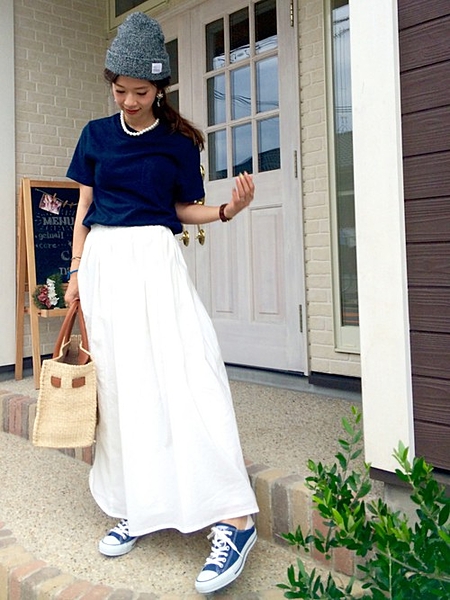 スカートを主役にしたマリンコーディネートの完成。
