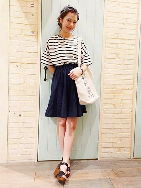 カジュアルな印象のボーダートップスは、肩のラインを落とすことで、女性らしさを演出しています。腕をまくることで、抜け感をプラスするのが着こなしのポイントです。