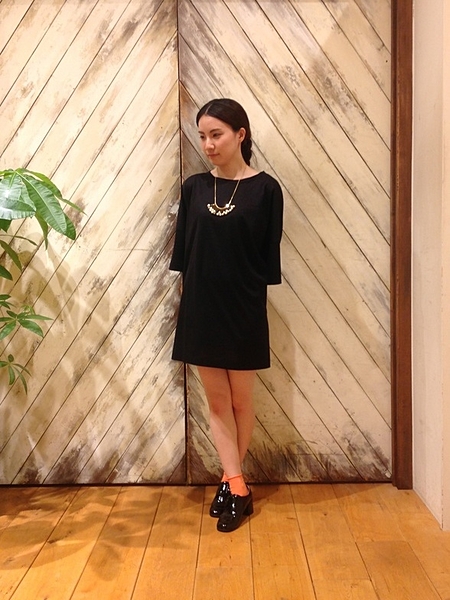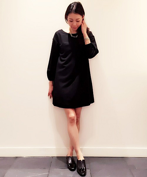 袖の折り返しがキュートなシンプルだけど繊細なブラックドレス☆ワイドにひろがった襟元がすっきり綺麗なシルエットに見せてくれます。