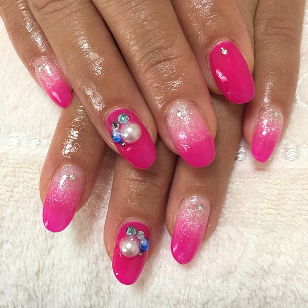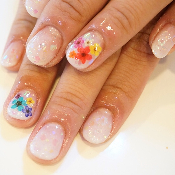 こちらは、淡いピンクのグラデーションに白いお花を埋め込んだフェミニンなネイルです。