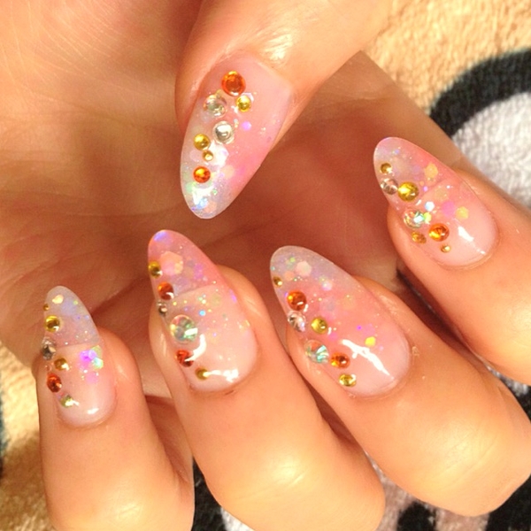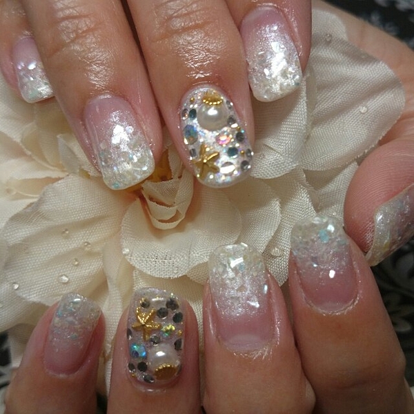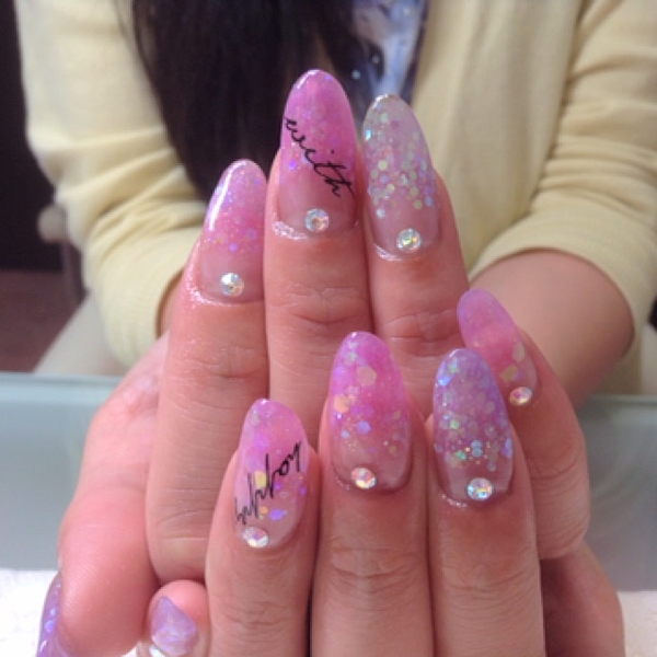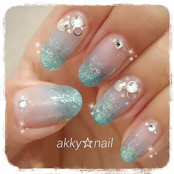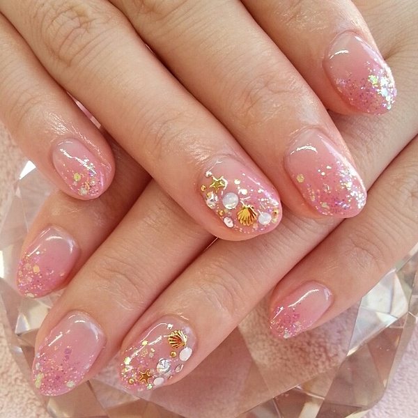 ネイルできたー。 時間ないし、皆泣き出すし… でもなんとか出来た(*^^*) 明日は海インだからブルー&パープルのグリッター混ぜてシェルパーツ入れてみた~ 途中めんどくさくなってグリッターの中に爪突っ込んだらグラデ失敗ww http://t.co/c9QkVYGUyY