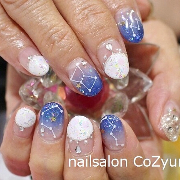 ネイル!青グラデに星散りばめたのと、白フレンチにゴールドラメとレース*・゜゚・*:.。..。.:*・'(*゚▽゚*)'・*:.。. .。.:*・゜゚・* http://t.co/WEx0dTSdXU