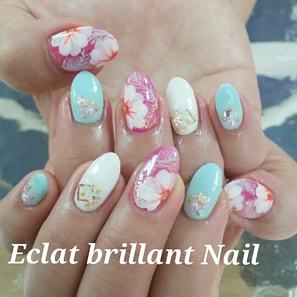 北欧風タッチの花ががかわいい。フレンチ部分にも小さな花を配置して、トータルバランスの取れたデザイン。