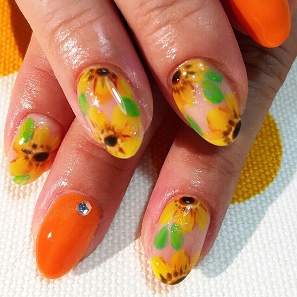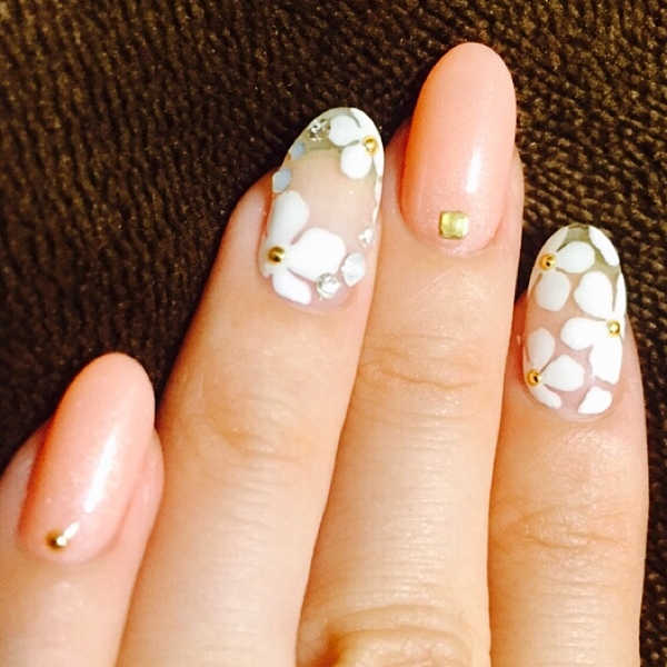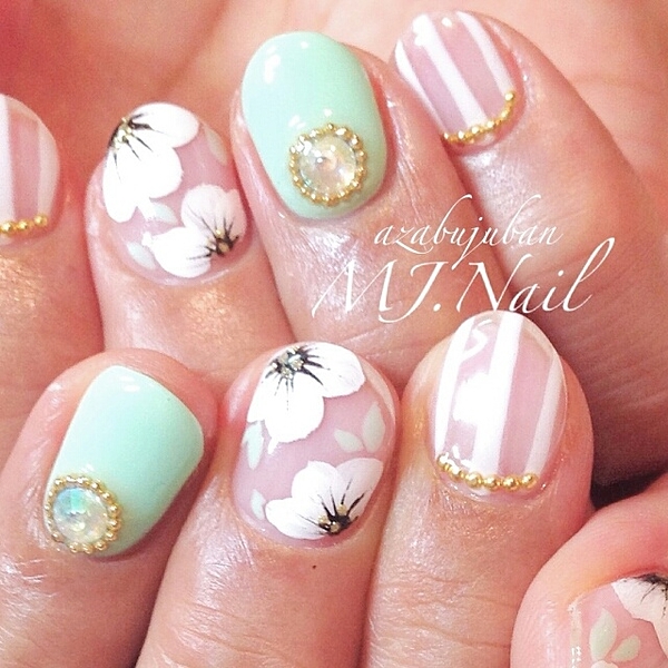 全体を描かない花柄なら短いネイルでも映えるデザイン。