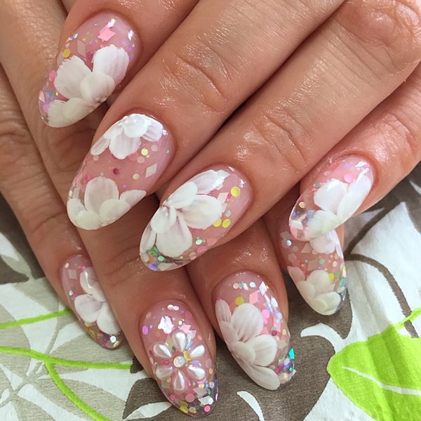 カラフルなラメを散りばめたクリアベースに大胆に大ぶりの花柄をペイント。華やかで透明感のあるデザイン。