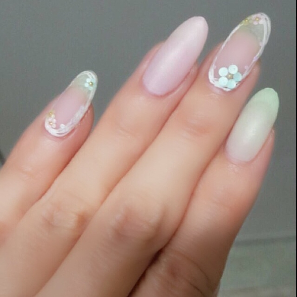 トレンドのマットコートにポイントにホログラムの花を配置。すりガラスのような質感と掠れたような囲みラインでニュアンスのあるデザイン。