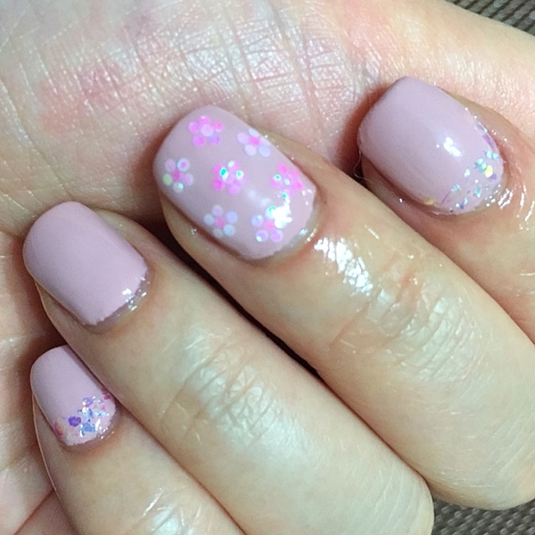 ピンク、ブルー、ホワイトの丸ホロをつかってカラフルな花柄ネイル。1本だけでも十分華のあるデザインに。
