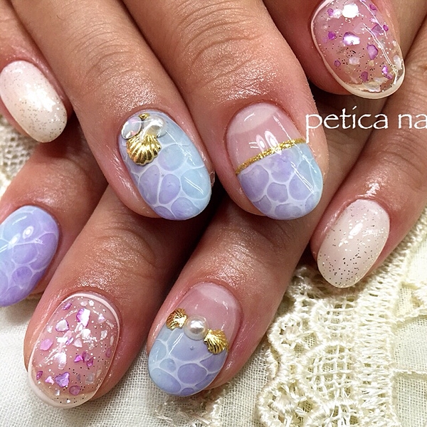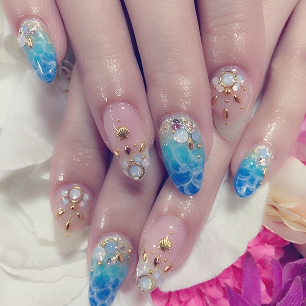 夏だからこそ出来るネイルを、思い切り楽しみませんか?夏のお出かけといえば、海。そんな綺麗な海の波打ち際の水面のような“落とし込みデザイン”を取り入れて夏を満喫しちゃいましょう◎落とし込みデザインを何本か取り入れるだけで、一気に夏感の溢れる素敵なネイルになります♭