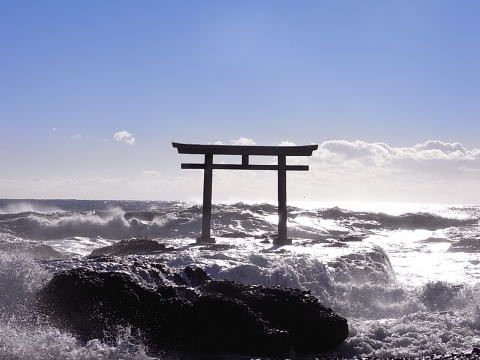 海上の大きな岩の上にぽつんと立つ神磯の鳥居は目を引くので見つけやすそう。