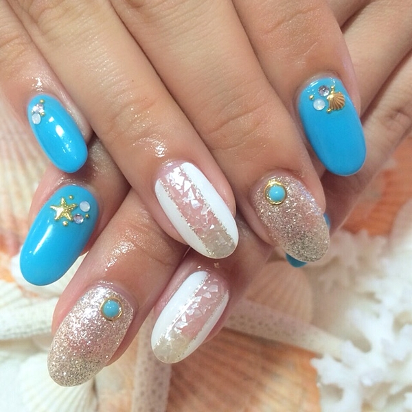 ブルーのグラデーションにシェルをのせた海にぴったりのネイル☆