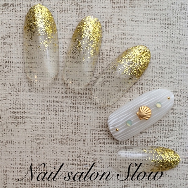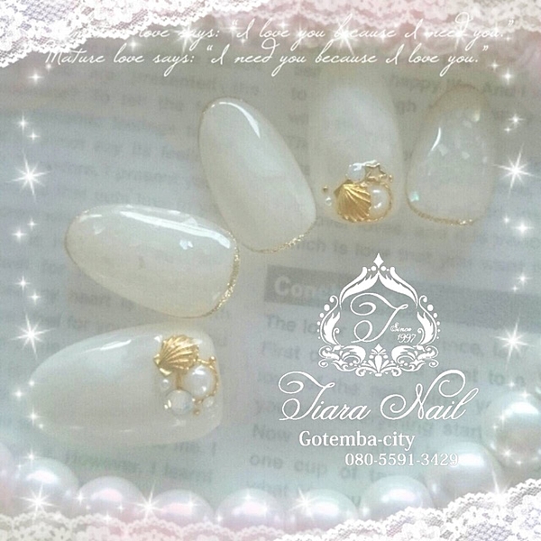 ホワイトのグラデーションにシェルをかさねた涼しげネイル☆