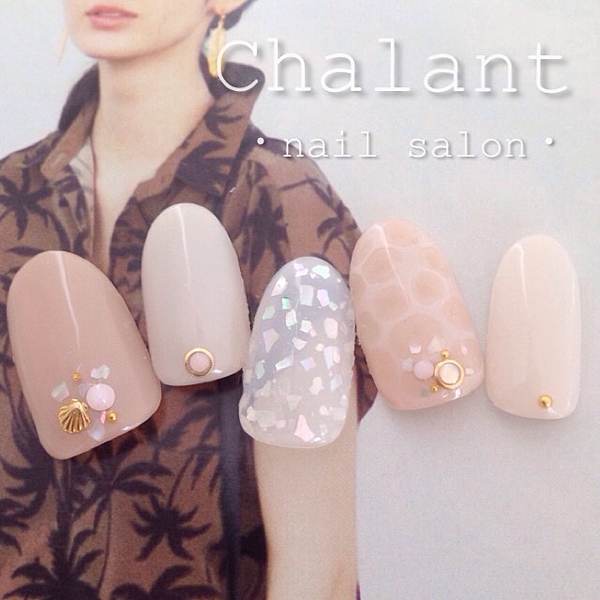 ホワイトベースにストーンやパール、シェルやスタッズをのせて、きれいにまとめています♡