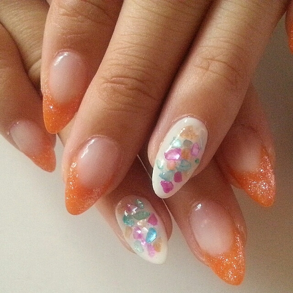 ジェルやりかえた〜クラッシュシェルにシェルパーツで夏ネイル。グリーンのグラデはジェルだけにしてシェル乗せない方が良かったかな… http://t.co/yILUDLcQat