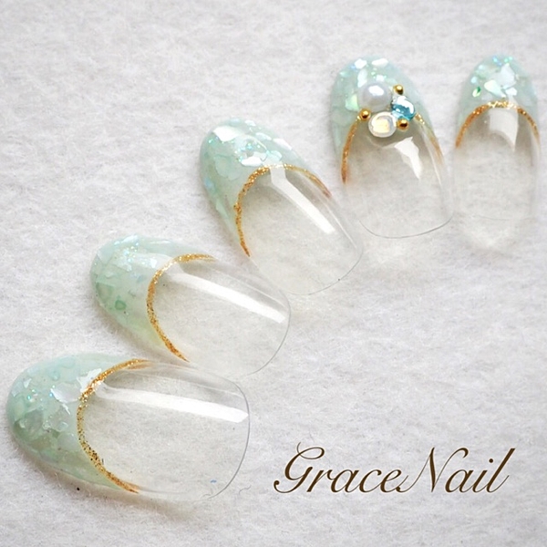 ブルーやパープルのふんわりグラデベースに、ぷっくり大きなシェルが目を引くデザイン!
