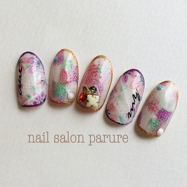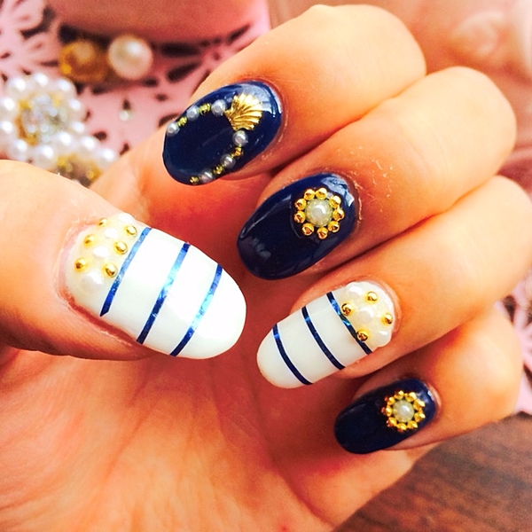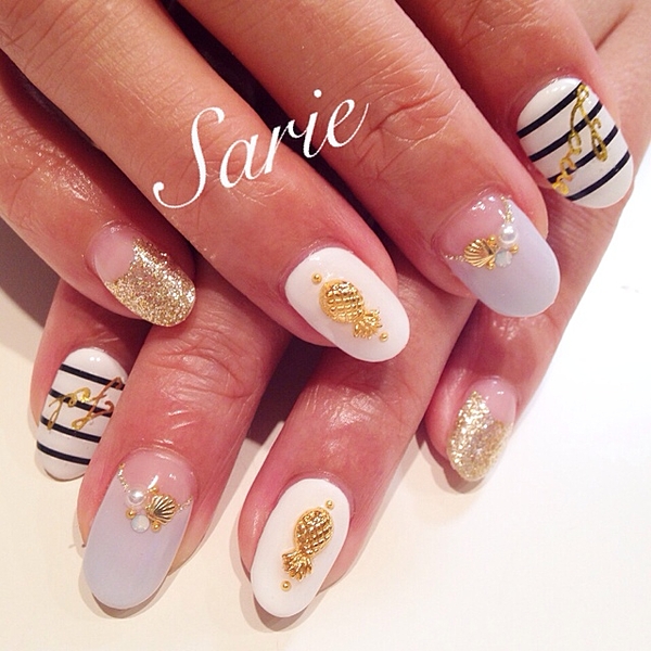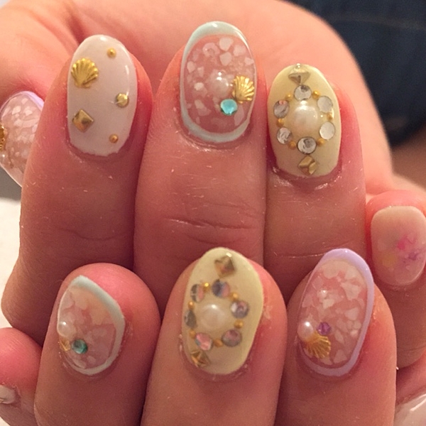 パステルカラーの丸フレンチにさりげなくシェルをミックス。やわらかい雰囲気でかわいい。