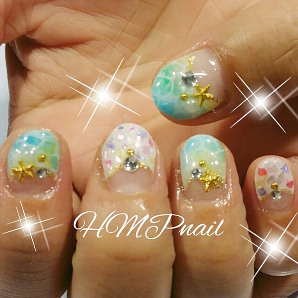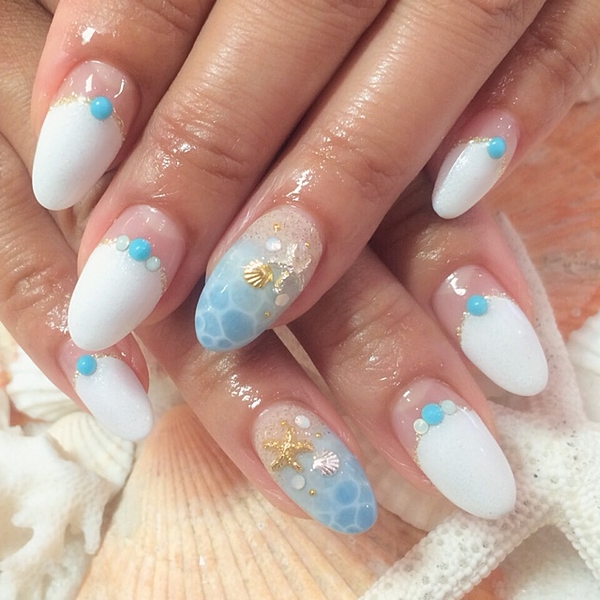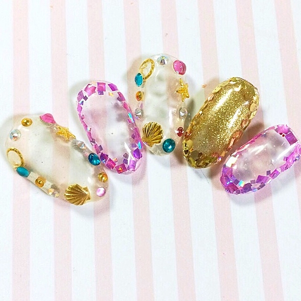 クリアベースにシェルや夏らしいパーツで縁取りを施したデザイン。パーツを乗せるだけなのでセルフ派さんにも簡単できちゃう。