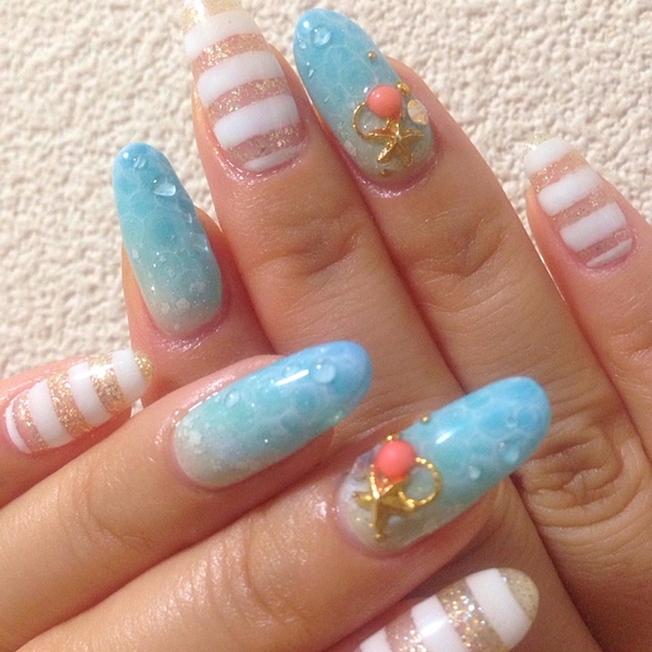 水滴ネイルとラグーンネイルを組み合わせた夏らしさ満開のネイルデザイン。ボーダーも組みあわせて夏をふんだんに取り入れたネイルデザイン。