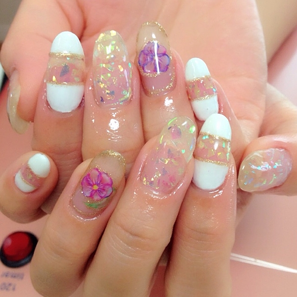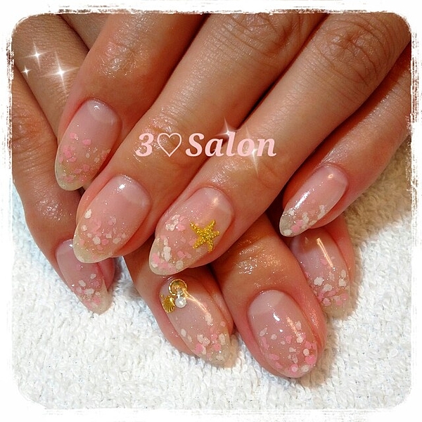 ピンクのとホワイトのシェルを散りばめたネイル。クリア部分を多く残すのが今年っぽい☆ヒトデのモチーフも人気です。