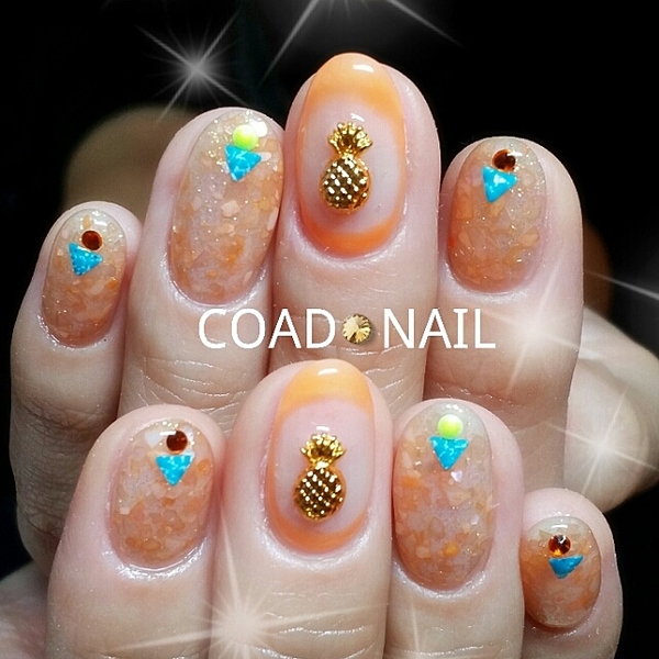 クラッシュシェルを埋め込んだシェルネイルも昨年に引き続き流行のデザイン。