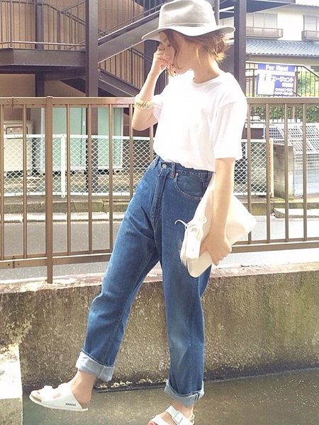 Tシャツに太めのパンツも