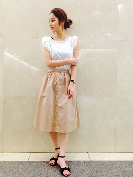 足元をスニーカーにすれば、ガーリーさを抑えてくれてヘルシーに着こなせます