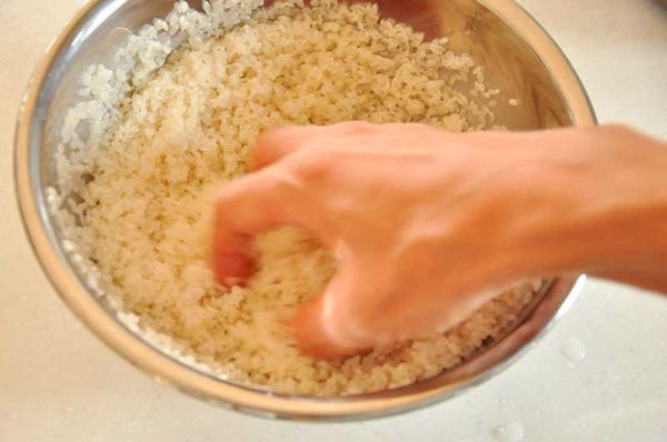 一度水を捨てたお米を丁寧に揉みます。