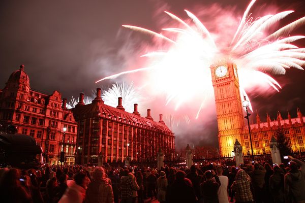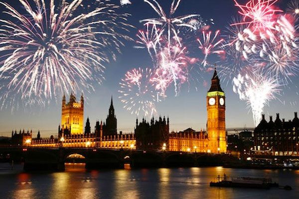 ビッグベンを中心にあちこちから花火が打ち上げられ