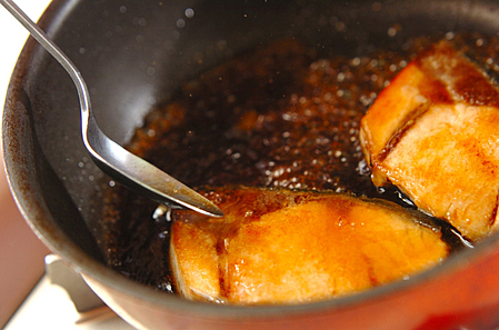 タレにトロミがついてきたらブリにからめて器に盛りましょう!