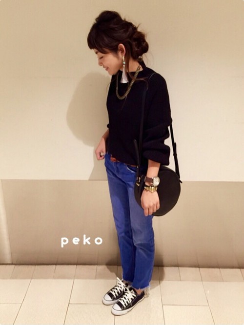 http://wear.jp/ とろみのあるプルオーバーとロングスカートにスニーカーの楽ちんキュートなコーデ。頭の形がコロンと丸く見えるルーズなお団子ヘアのラフさがピッタリ◎