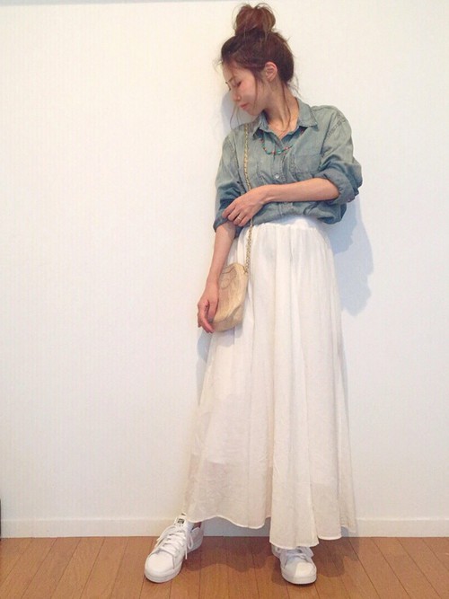 http://wear.jp/ デニクシャツにホワイトのシフォンスカートを合わせたフェミニンなカジュアルコーデ。ルーズなお団ヘアのアンニュイン雰囲気がピッタリですね♪