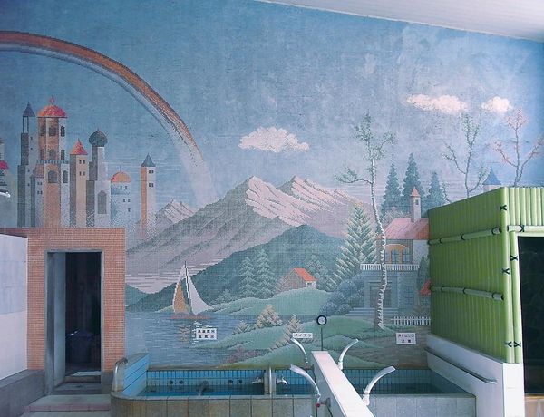 @hamuwo860 ふくの湯さんは有名なデザイナーズ銭湯。脱衣場も浴室も木を基調としていてオシャレ。浴室を分ける壁にもアート作品が描かれている。スタイリッシュだけど、決していけすかないかんじではなくてあたたかいのです。 https://t.co/sTijslSq8o