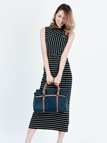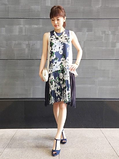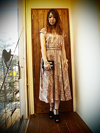 ダークブラウンのバーチカルストライプ&ピンクのフラワーモチーフのコントラストが印象に残るドレス。
