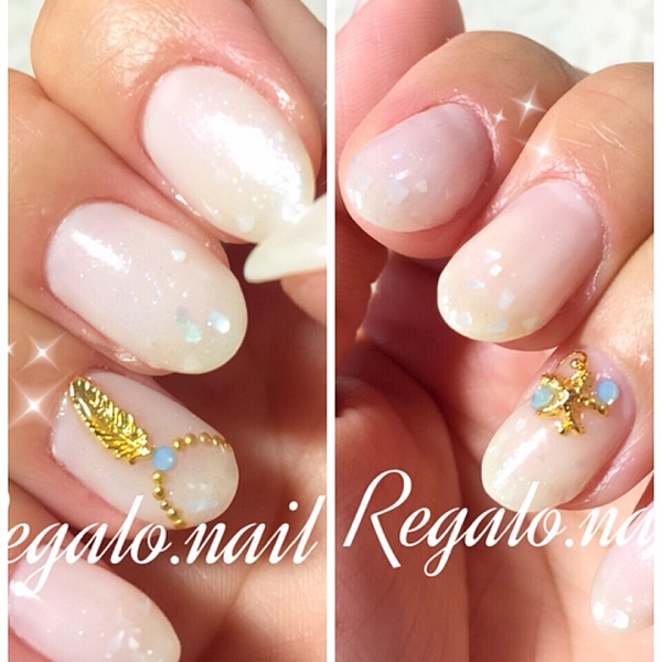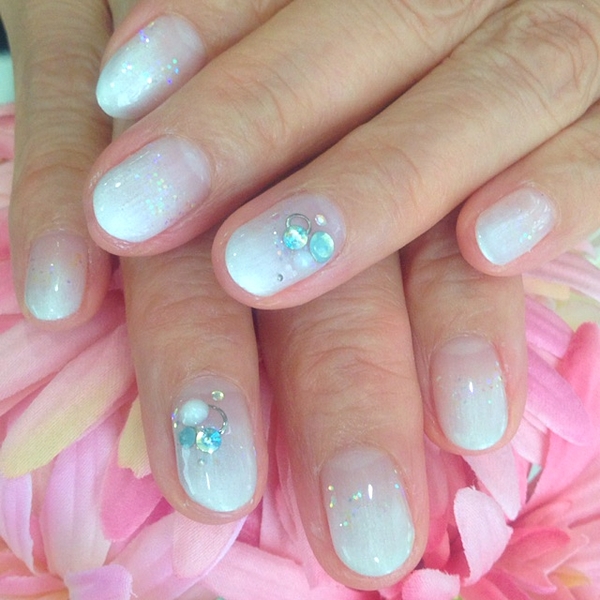 クリアに近い白ネイルですね。ランダムに付けたデコレーションが可愛らしいですね。