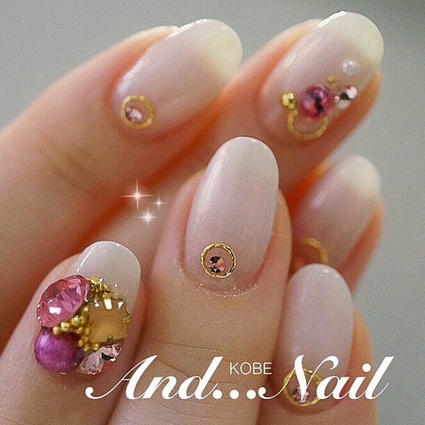 ややピンクに近い白のネイルでフェミニンなイメージになっていますね。バラの華やストーンをのせてとってもゴージャスなネイルになっていますね。