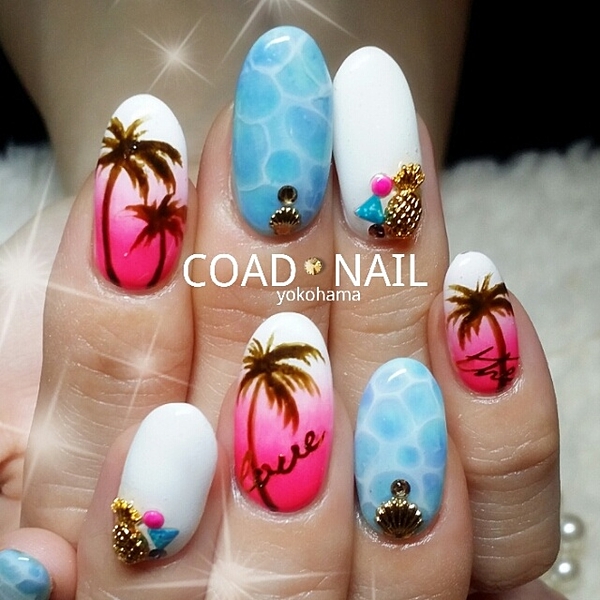 夏と言えば、花火に海!花火に海といえば、浴衣に水着♡みなさん、そんなイベント盛りだくさんの夏のネイルはお決まりですか?今回は浴衣や水着に合うネイルを紹介します*ヤシの木、フルーツ、花柄、シェル、ターコイズの5種類のデザインがたくさん♡ぜひ夏ネイルの参考にしてください!