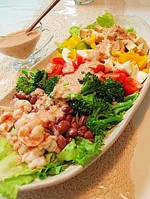 手作りの豆腐マヨネーズと豆腐チーズを使ったコブサラダのレシピ。ブロッコリーや豆、パプリカなど多種の野菜を盛り込んだ健康サラダはいかがですか?このコブサラダがあるだけで、食卓が華やかになりますね。