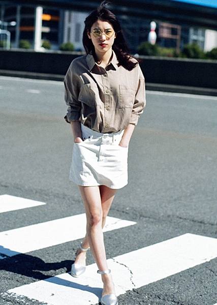 ルーズなサイジングのシャツを、ショートパンツにイン!大人上品かつビジネススタイルにするなら、テロンとした肌触りのよい素材を選んでみて。また、足元はシルバーカラーで、派手すぎないアクセントをプラス!