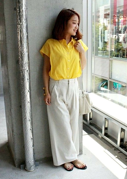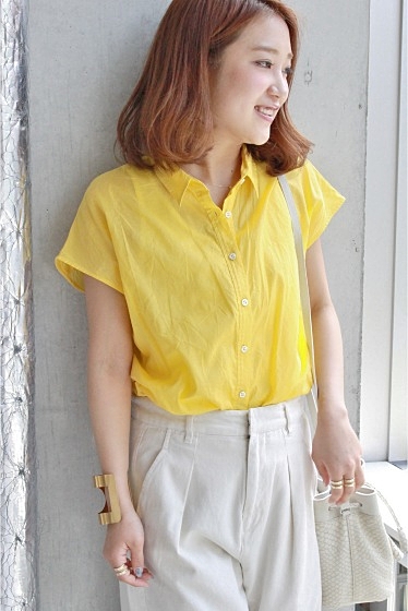ベーシックな形のシャツも、カラ―使いでさまざまな印象に!これからの季節は、パッと明るい印象にしてくれるイエローカラ―に注目を。ボトムスには、ゆったりとしたワイドパンツを合わせて、大人な印象に。