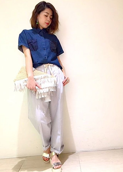 派手過ぎず、きちんと主張してくれるデニムシャツ。胸ポケットのネイビーカラ―がワンポイントになっています!淡いカラ―のボトムスと合わせれば、スッキリとした着こなしに。