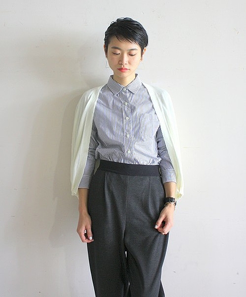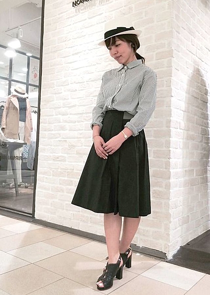 オフィススタイルと聞いて、欠かせないのが、ストライプ柄。着るだけで清潔かつさわやかな印象にしてくれます。まずは、トップスとボトムスのカラ―を統一して、ワントーンスタイルで着こなしてみて。