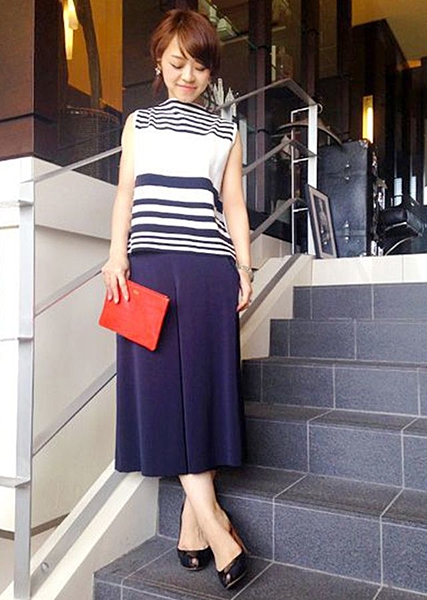 季節感を出すなら、ボーダー柄のマリンテイストなトップスを取り入れてみて。ベーシックなカラ―で統一されたスタイルには、オレンジやイエローなど派手カラーの小物がよく合います。足元はパンプスで、大人らしさも忘れずに。