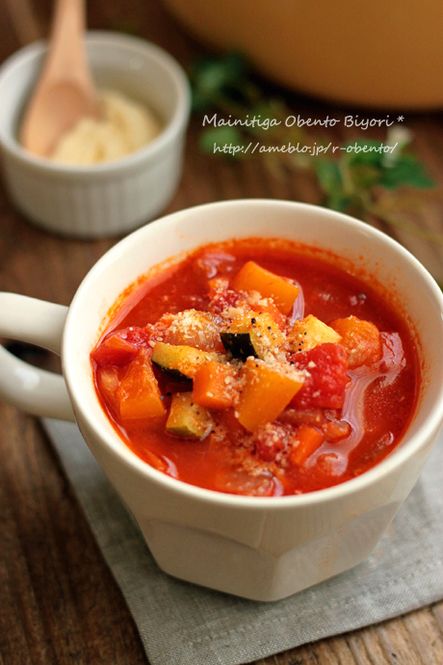 ・キャベツ、玉ねぎ、セロリ、ホールトマト、コンソメ、塩コショウで作ったスープを普段の食事と一緒に食べるだけ