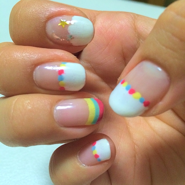 @emon0226 学生のときのテープ捨てちゃったからまず買ってくるとこからだけどね!! フレンチネイルするのはマスキングして塗るのがいいらしいよ(・∀・)
