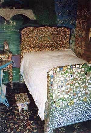 内壁はもちろん、机や椅子、ミシン、ベッド、暖炉、庭に至るまですべて陶器のモザイクで彩られているんです。